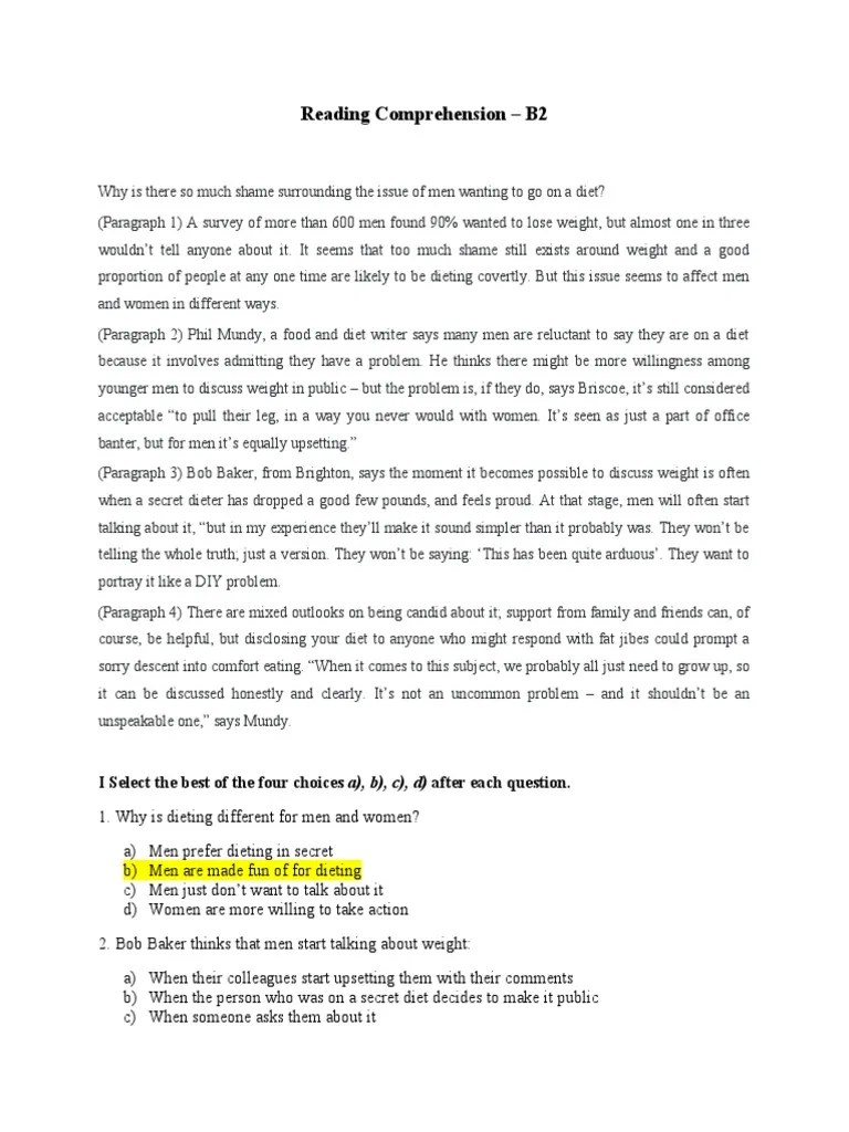 Reading Comprehension B2 Pdf With Answers